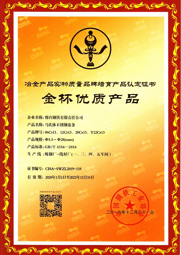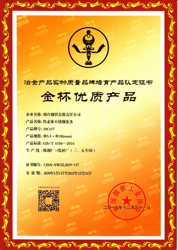 邢鋼鐵素體不銹鋼盤條10Cr17 φ5.5-18mm規(guī)格獲冶金產(chǎn)品實物質(zhì)量金杯優(yōu)質(zhì)產(chǎn)品認定證書