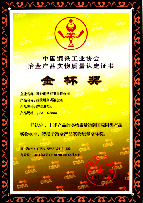 拉拔用高碳鋼盤條SWRH72A獲冶金產(chǎn)品實(shí)物質(zhì)量金杯獎(jiǎng)