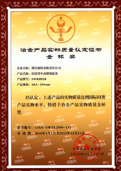 拉拔用中高碳鋼盤條SWRH82B獲冶金產(chǎn)品實(shí)物質(zhì)量金杯獎
