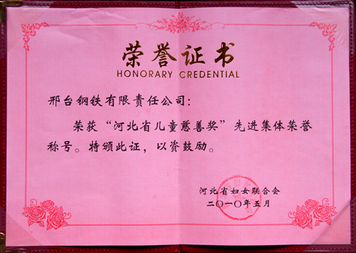 2010年5月,邢鋼榮獲“河北省兒童慈善獎(jiǎng)”先進(jìn)集體榮譽(yù)稱號(hào)。