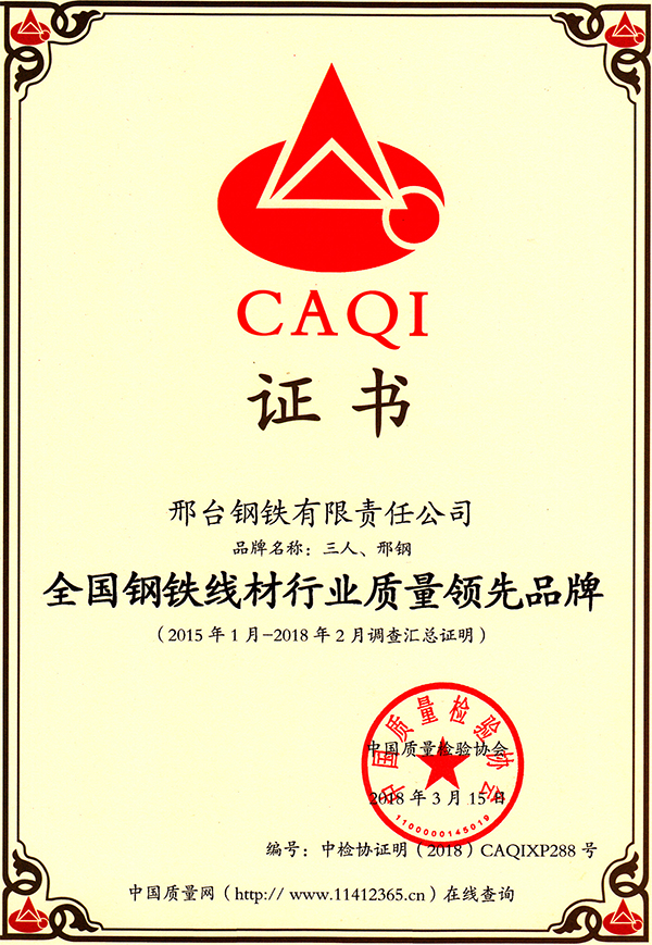 2018年3月15日,邢鋼“三人、邢鋼”品牌獲得“全國(guó)鋼鐵線(xiàn)材行業(yè)質(zhì)量領(lǐng)先品牌”稱(chēng)號(hào)。
