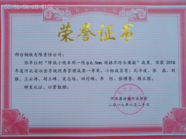 河北省冶金行業(yè)協(xié)會(huì)于6月份在秦皇島召開了“全省冶金行業(yè)質(zhì)量管理優(yōu)秀成功發(fā)布會(huì)”,邢鋼線材廠小線車間工藝技術(shù)QC小組《降低小線車間一線6.5mm規(guī)格不冷頭圈數(shù)》在發(fā)布會(huì)上進(jìn)行了成功發(fā)布,獲得本次發(fā)布會(huì)一等獎(jiǎng)的好成績。