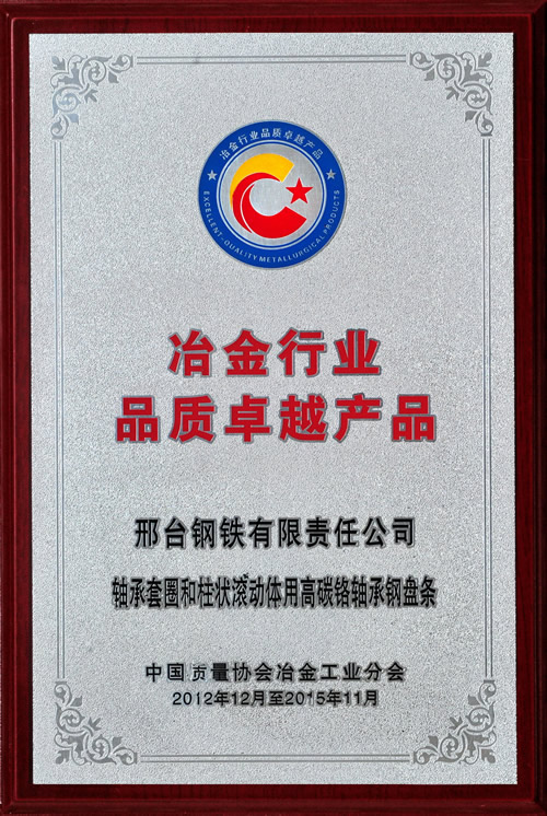 - 2012年度,中國(guó)質(zhì)量協(xié)會(huì)冶金分會(huì)對(duì)我公司申報(bào)的“冶金行業(yè)品質(zhì)卓越產(chǎn)品”進(jìn)行了受理評(píng)價(jià)。邢鋼公司生產(chǎn)的規(guī)格φ5.5-16mm 軸承鋼GCr15 獲得“冶金行業(yè)品質(zhì)卓越產(chǎn)品”榮譽(yù)稱(chēng)號(hào),為進(jìn)一步拓展市場(chǎng)、滿(mǎn)足高端用戶(hù)的質(zhì)量需求提供了質(zhì)量保證能力。