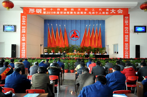 1月4日上午八時,公司會議中心花團錦簇,現場氣氛莊重熱烈,在莊嚴的國歌聲中,公司第十四屆四次職工代表大會暨2011年度勞動競賽先進集體、先進個人表彰會隆重召開。公司領導袁世臻、王春雨、張永藏、苑?,F、梁鋒、戴鶴祥、劉蘭宗、孔俊其、周兵晨、李喜山出席了會議。邢臺市總工會副主席宋起香應邀到會并致詞。