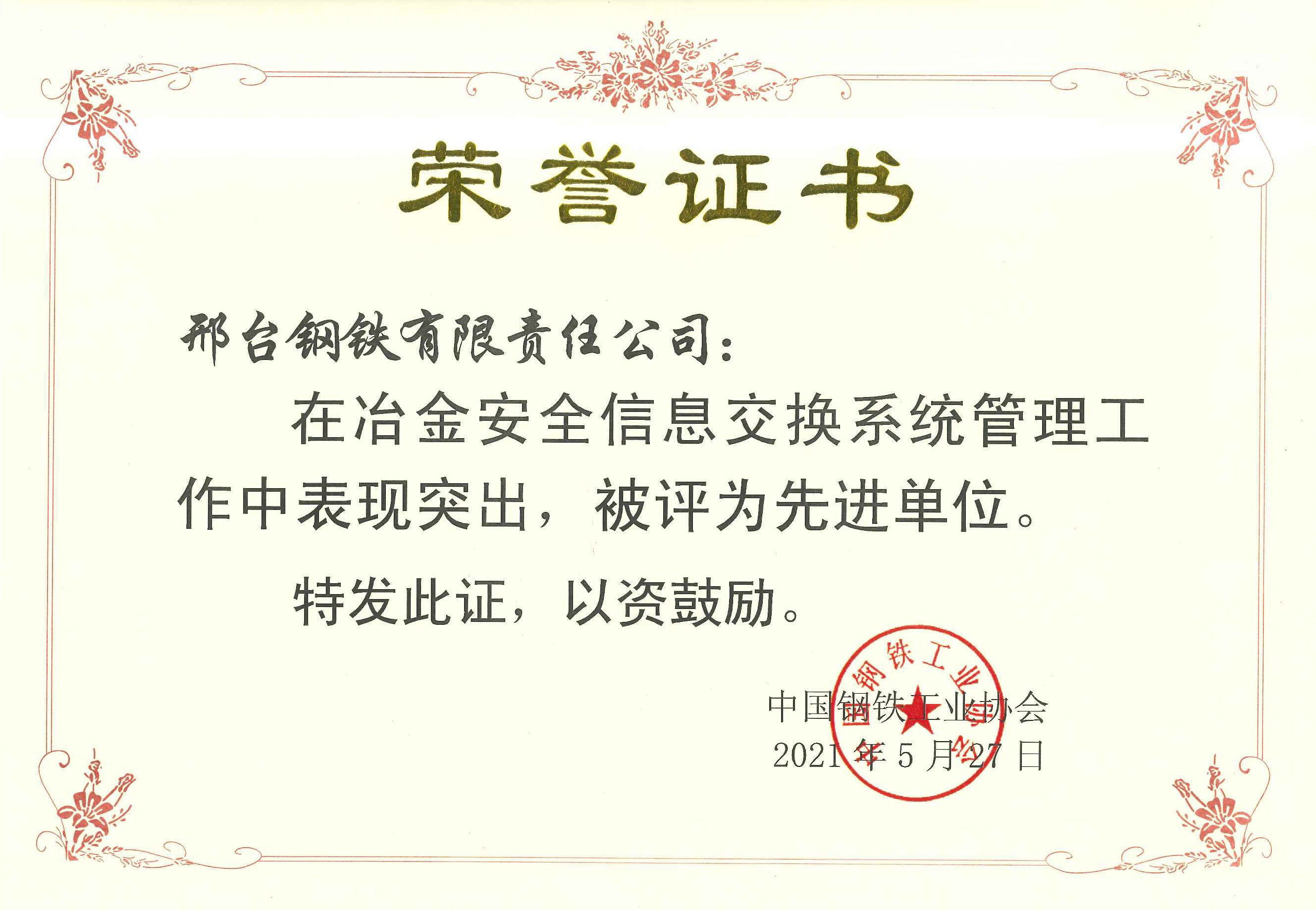 近日,邢臺鋼鐵有限責任公司(以下簡稱邢鋼)收到中鋼協(xié)〔2021〕73 號文《關于表彰冶金安全信息交換系統(tǒng)管理工作先進單位和先進個人的決定》及榮譽證書,邢鋼在冶金安全信息交換系統(tǒng)管理工作中表現(xiàn)突出,被評為先進單位。