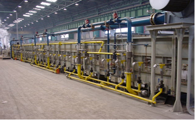 4、索氏體化淬火:采用熔融的鉛作為淬火劑,在600℃左右完成鋼絲組織由奧實體化向索氏體化的轉變。采用燃氣分二段供熱,各段單獨控溫,根據(jù)鉛溫要求及時調(diào)整供熱負荷。