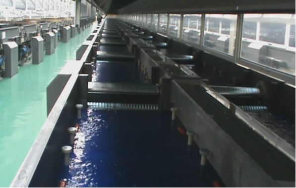 6、鍍銅:屬于堿性鍍銅,分為26線和7+7線,每條線均有21個(gè)鍍槽,控制方式為集絲集控和單絲單控, 7+7型為單絲單控,可以同時(shí)生產(chǎn)14種規(guī)格和工藝各不相同的鋼絲,每條線的工藝參數(shù)如電流和速度等都可以單獨(dú)控制。而26線為集絲集控,其中26線采用銅粒做為消耗補(bǔ)充,7+7線采用銅板作為消耗補(bǔ)充。