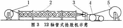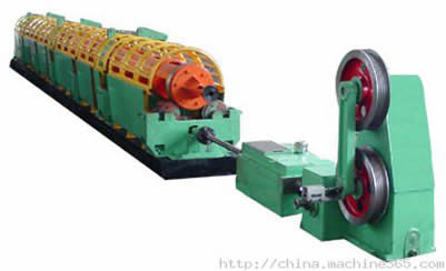 卷線:將鋼絲線盤,重新卷在捻股機(jī)的工字輪上;也可將鋼絲從拔絲機(jī)后直接卷到工字輪上;捻股:將鋼絲捻成繩股。捻股機(jī)有筐籃式、軸管式、無(wú)管式和雙捻機(jī)等。圖3為12軸管式捻股機(jī)示意圖,1是裝下層繩股的工字輪,2是旋轉(zhuǎn)的機(jī)筒,內(nèi)裝12個(gè)卷滿鋼絲的工字輪,3是成股的壓線瓦,4是牽引輪,5是上層繩股的收線輪,機(jī)筒旋轉(zhuǎn)一周,牽引輪引出的繩股長(zhǎng)度即為股的捻距。