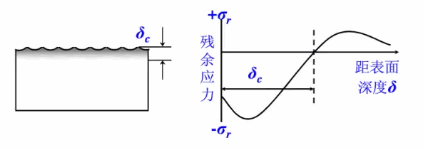 噴丸強(qiáng)化影響工件表面深度取決于工作自身強(qiáng)度,工件自身強(qiáng)度越高,影響深度越小。通常影響深度為0.1-0.8mm。下圖是高強(qiáng)鋼(σb=1900MPa)噴丸殘余應(yīng)力分布曲線,圖中可見(jiàn)噴丸強(qiáng)度由0.13Amm增高至0.75Amm,導(dǎo)致δc由0.15mm增至0.55mm,但表面殘余應(yīng)力和最大殘余應(yīng)力變化不明顯。