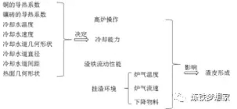 對于爐腹、爐腰及爐身下部等高熱負荷區(qū)域,無論是鑄鐵冷卻壁還是銅冷卻壁,渣皮的保護作用對冷卻系統(tǒng)的長壽至關(guān)重要。冷卻壁熱面存在穩(wěn)定渣皮時,塊狀帶物料、熔融渣鐵及高溫煤氣等不能直接接觸冷卻壁壁體,從而減少磨損、渣鐵侵蝕、“氫病”及有害元素等問題的發(fā)生,大幅提高冷卻壁壽命。渣皮的形成過程受多方面因素影響,如圖1所示。