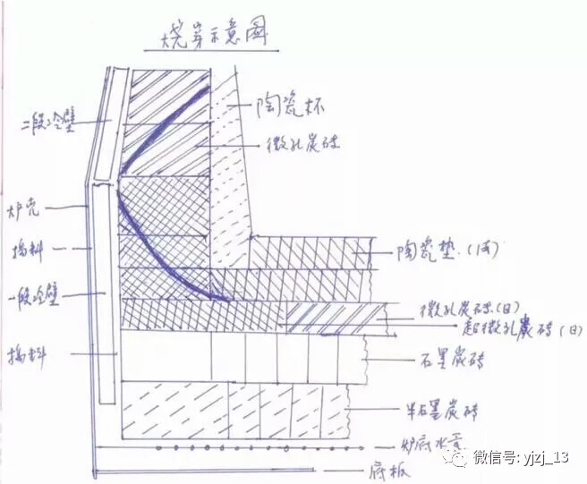 (1)爐底立砌2層國產(chǎn)炭磚,每層600mm;下層半石墨,上層石墨;第三層平砌一層日本產(chǎn)微孔炭磚,400mm;再上為法國陶瓷墊,兩層各400mm;