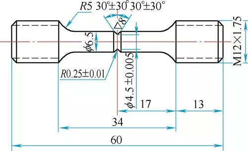 第三,試樣的制造。按圖沿材料的順纖維方向加工試樣,粗加工后熱處理至所要求的抗拉強(qiáng)度,然后精加工至規(guī)定尺寸,缺口用中軟細(xì)粒氧化鋁砂輪磨制。磨削時應(yīng)保證缺口根部半徑圓滑。磨削后投影檢查,確保缺口尺寸符合圖紙要求。逐根測量缺口根部直徑(圖中為φ4.5?0.05mm)的尺寸,并做好編號記錄。