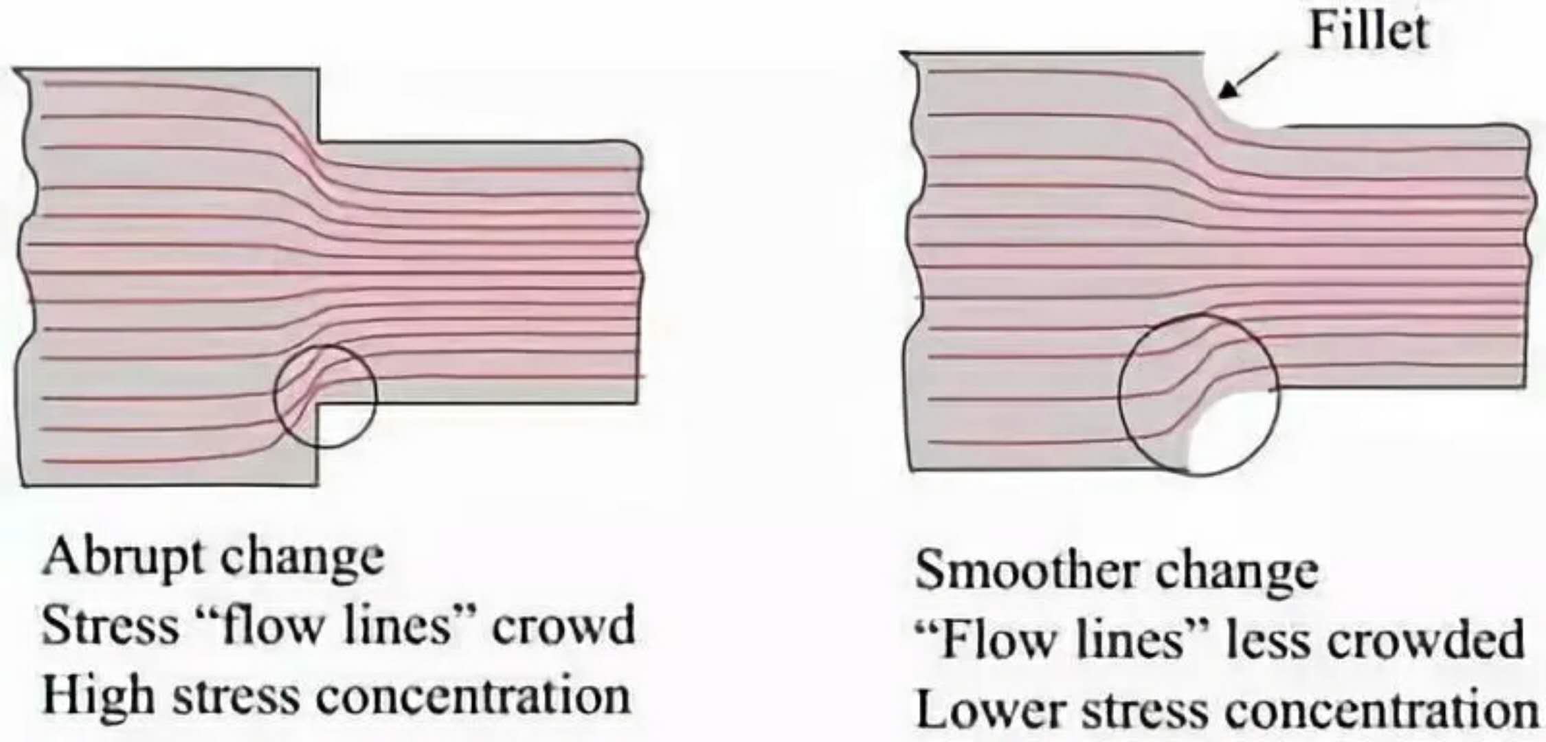 實際上,所有的疲勞失效都發(fā)生在應(yīng)力集中點或應(yīng)力集中處的零件的外表面上。例如,凹槽、圓角、孔、螺紋、鍵槽、花鍵、焊縫等。如果該部件提供長期無故障的服務(wù),設(shè)計者必須考慮到這些應(yīng)力提升器的影響。應(yīng)力集中的作用直接與其半徑小有關(guān)。與先前提到的促進疲勞失效的微裂紋一樣,應(yīng)力發(fā)生位置的半徑越小,產(chǎn)生的應(yīng)力越集中越大。有趣的是,應(yīng)力集中對高延展性的金屬影響很小。其解釋是,由幾何變化引起的應(yīng)力集中被限制在屈服應(yīng)力,止于塑性變形。