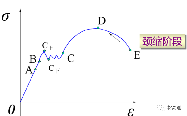 a是低碳鋼的應(yīng)力-應(yīng)變曲線,它有鋸齒狀的屈服階段,分上下屈服,均勻塑性變形后產(chǎn)生縮頸,然后試樣斷裂;