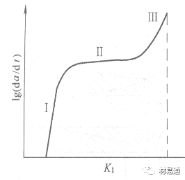 當(dāng)裂紋尖端的KI>KISCC時(shí),裂紋就會不斷擴(kuò)展。單位時(shí)間內(nèi)裂紋的擴(kuò)展量叫做應(yīng)力腐蝕裂紋擴(kuò)展速率,用da/dt表示。裂紋的擴(kuò)展速率da/dt隨著應(yīng)力強(qiáng)度因子K1而變化。