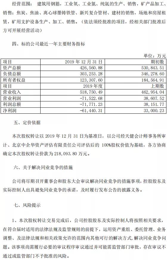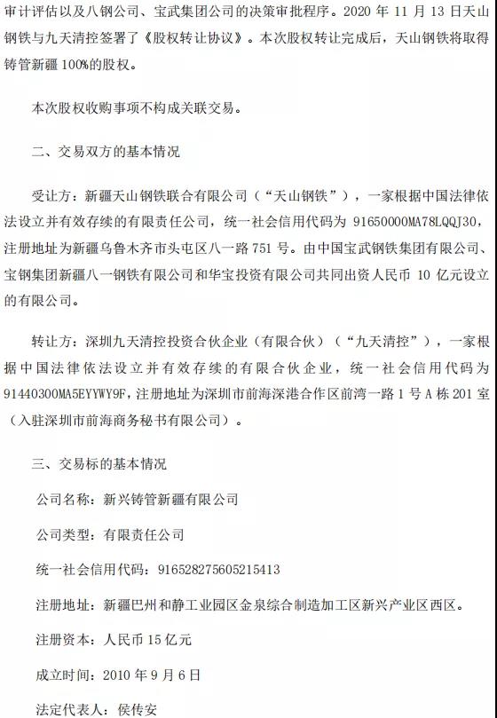 11月13日晚間,八一鋼鐵發(fā)布公告稱,該公司控股股東寶鋼集團(tuán)新疆八一鋼鐵有限公司的控股子公司新疆天山鋼鐵聯(lián)合有限公司擬受讓深圳九天清控投資合伙企業(yè)持有的新興鑄管新疆有限公司100%股權(quán)。11月13日,天山鋼鐵與九天清控簽署了《股權(quán)轉(zhuǎn)讓協(xié)議》。本次股權(quán)轉(zhuǎn)讓以2019年12月31日為基準(zhǔn)日,以公司經(jīng)天健會(huì)計(jì)師事務(wù)所審計(jì)、北京中企華資產(chǎn)評(píng)估有限責(zé)任公司評(píng)估后的100%股權(quán)價(jià)值為基礎(chǔ),各方協(xié)商確定本次股權(quán)轉(zhuǎn)讓價(jià)款為21.81億元。