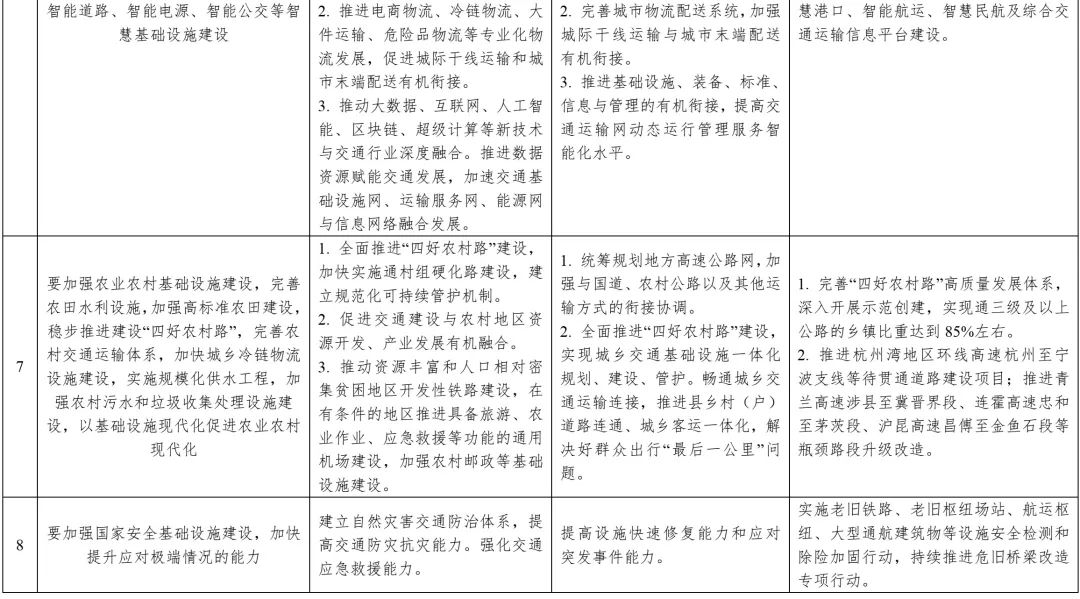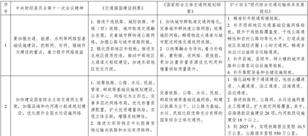 中央財(cái)經(jīng)委員會第十一次會議要求內(nèi)容與中共中央、國務(wù)院印發(fā)的《交通強(qiáng)國建設(shè)綱要》《國家綜合立體交通網(wǎng)規(guī)劃綱要》《“十四五”現(xiàn)代綜合交通運(yùn)輸體系發(fā)展規(guī)劃》等政策文件一脈相承,并有所側(cè)重,強(qiáng)化了交通、能源、水利、城鎮(zhèn)和科技等基礎(chǔ)設(shè)施在國內(nèi)國際雙循環(huán)相互促進(jìn)過程中的重要紐帶作用和產(chǎn)業(yè)鏈供應(yīng)鏈安全穩(wěn)定的保障基石作用,對構(gòu)建現(xiàn)代化基礎(chǔ)設(shè)施體系、推動經(jīng)濟(jì)高質(zhì)量發(fā)展具有重要指導(dǎo)意義。同時(shí),兼顧了有序推進(jìn)地下綜合管廊建設(shè),加強(qiáng)城市防洪排澇、污水和垃圾收集處理體系建設(shè),加強(qiáng)防災(zāi)減災(zāi)基礎(chǔ)設(shè)施、公共衛(wèi)生應(yīng)急設(shè)施和國家安全基礎(chǔ)設(shè)施建設(shè);推進(jìn)重點(diǎn)水源、灌區(qū)、蓄滯洪區(qū)建設(shè)和現(xiàn)代化改造等內(nèi)容。表1為中央財(cái)經(jīng)委員會第十一次會議基礎(chǔ)設(shè)施建設(shè)有關(guān)內(nèi)容與相關(guān)政策文件對照。