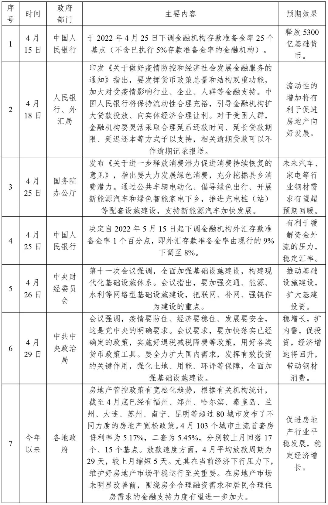 二是資金流動性充足,有力支撐投資增長和鋼材需求。4月15日中國人民銀行下調(diào)金融機(jī)構(gòu)存款準(zhǔn)備金率25個(gè)基點(diǎn)釋放約5300億基礎(chǔ)貨幣。2022年擬安排地方政府專項(xiàng)債券3.65萬億元,其中一季度專項(xiàng)債發(fā)行規(guī)模約為1.46萬億元,占全年的40%,幾乎是去年同期的4倍,預(yù)計(jì)大部分新增專項(xiàng)債將發(fā)行前移,今年專項(xiàng)債將重點(diǎn)用于交通基礎(chǔ)設(shè)施、能源、農(nóng)林水利、生態(tài)環(huán)保等方向;同時(shí),2021年四季度1.2萬億專項(xiàng)債也將在今年一季度逐漸轉(zhuǎn)化為實(shí)物工作量。此外,一季度新增人民幣貸款8.34萬億元,比上年同期多增了6636億元。4月1日至28日,已有約6250億元留抵退稅款退到企業(yè)賬戶,完成全年計(jì)劃留抵退稅款的41.7%左右;5月將提前退還小型和中型企業(yè)存量留抵稅額,此后還將加快大型企業(yè)退稅進(jìn)度。隨著資金流動性的改善和資金進(jìn)一步到位,基礎(chǔ)設(shè)施建設(shè)等行業(yè)投資力度將進(jìn)一步加大,固定投資增速有望持續(xù)攀升,進(jìn)而拉動鋼鐵消費(fèi)進(jìn)一步釋放。