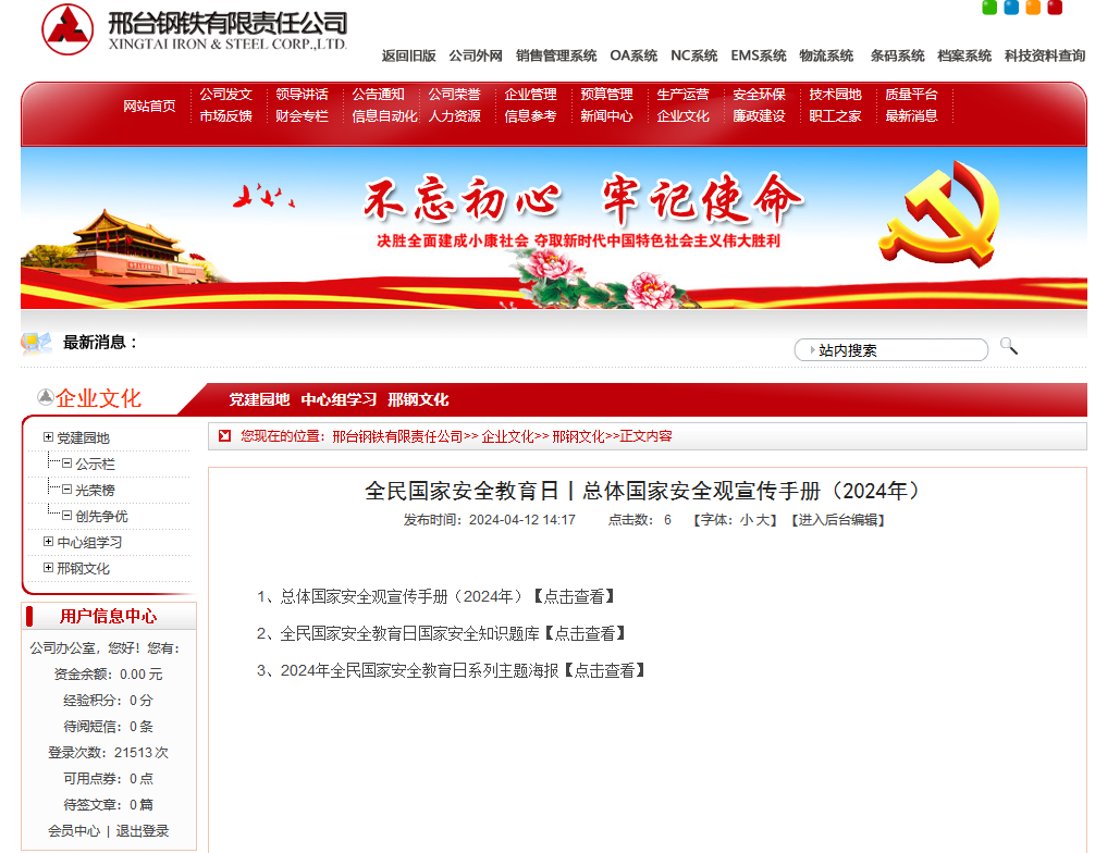 據(jù)悉,今年全民國(guó)家安全教育日的活動(dòng)主題為“總體國(guó)家安全觀·創(chuàng)新引領(lǐng)10周年”。活動(dòng)中,邢鋼公司高度重視,堅(jiān)定不移貫徹總體國(guó)家安全觀,提高政治站位,牢牢把握正確政治方向和輿論導(dǎo)向,并在教育活動(dòng)中,做到深入學(xué)習(xí)領(lǐng)會(huì)《習(xí)近平關(guān)于總體國(guó)家安全觀論述摘編》以及習(xí)近平總書(shū)記在黨的二十大報(bào)告中提出的:“推進(jìn)國(guó)家安全體系和能力現(xiàn)代化,堅(jiān)決維護(hù)國(guó)家安全和社會(huì)穩(wěn)定”的講話精神,廣泛宣傳憲法規(guī)定的公民維護(hù)祖國(guó)安全、榮譽(yù)和利益的基本義務(wù)。
