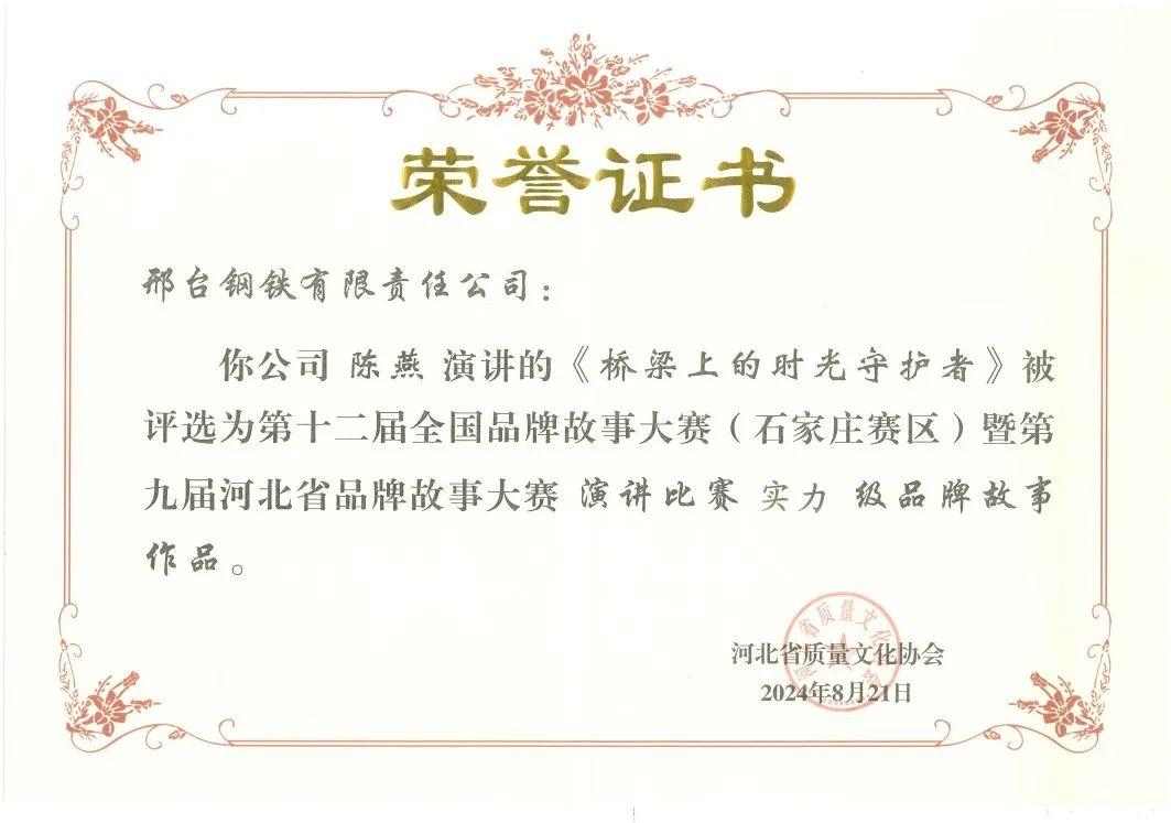 經(jīng)過激烈的角逐,邢鋼參賽的兩部演講作品《橋梁上的時(shí)光守護(hù)者》、《碧水守護(hù),打開泉城綠色畫卷》,憑借其鮮明的主題、完整的情節(jié)、生動(dòng)的語言、深刻的感染力以及自信的表現(xiàn)力脫穎而出,贏得本次大賽“實(shí)力級”榮譽(yù)。邢鋼申報(bào)的《赤子之心》、《三代邢鋼人共鑄輝煌夢》等征文、短視頻作品也榮獲“優(yōu)秀級”、“潛力級”證書。
