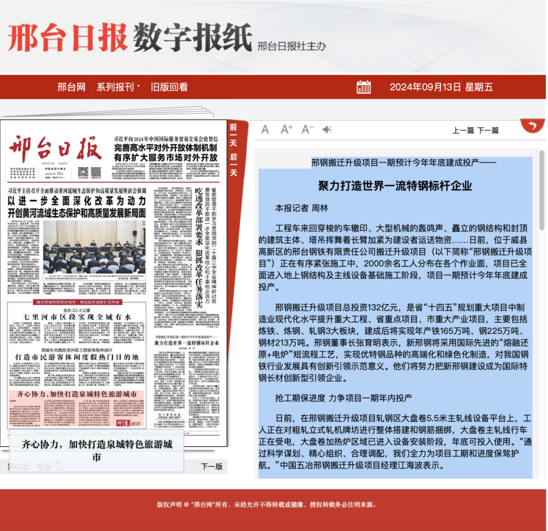邢鋼搬遷升級(jí)項(xiàng)目制定了各區(qū)域的施工進(jìn)度計(jì)劃表,倒排工期,搶工期,保進(jìn)度,力爭(zhēng)年內(nèi)實(shí)現(xiàn)項(xiàng)目一期順利投產(chǎn)。一期項(xiàng)目已累計(jì)完成投資46億元。目前,威縣還在同步推進(jìn)邢鋼搬遷鐵路專用線路項(xiàng)目,已獲得省發(fā)改委立項(xiàng)批復(fù)并列入國(guó)家重大項(xiàng)目庫。