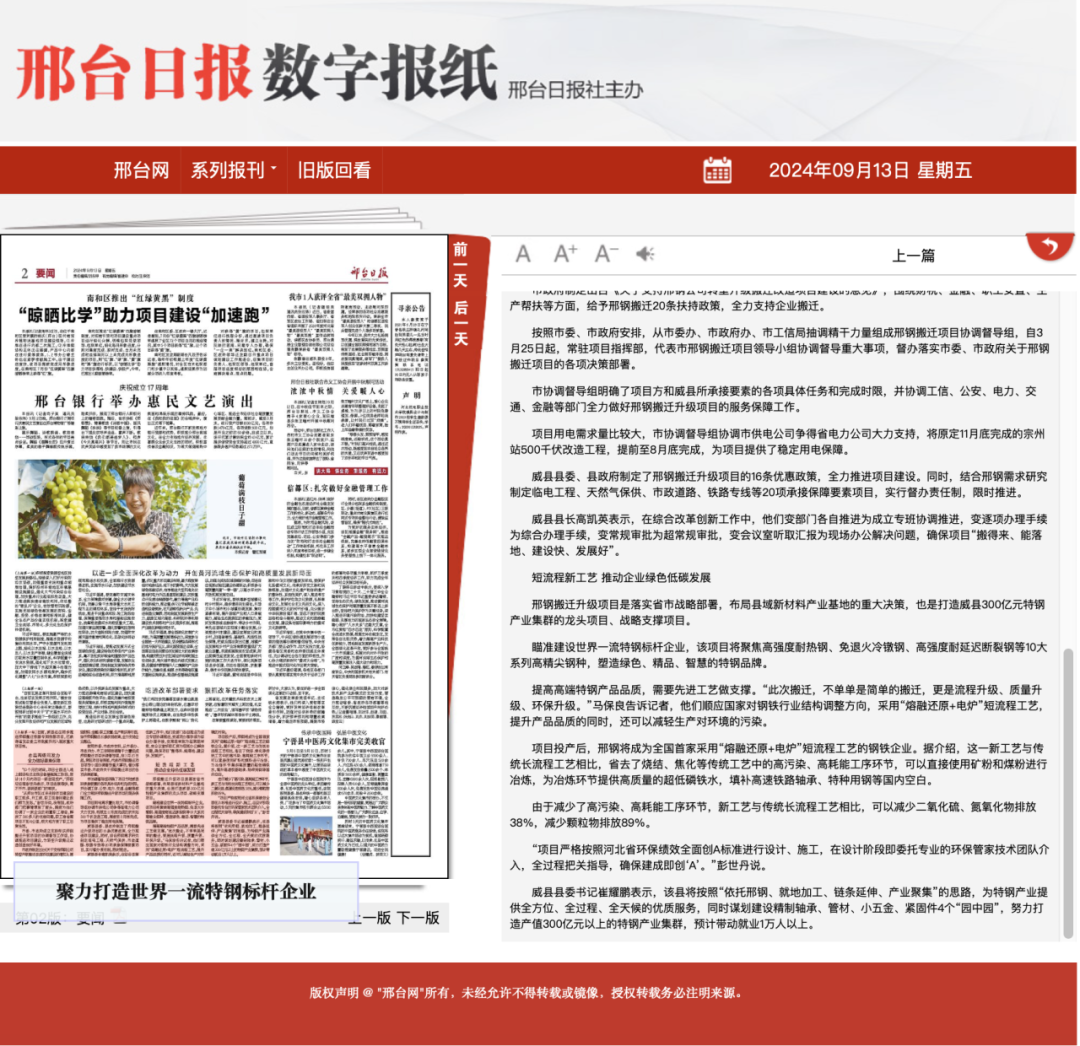 邢鋼搬遷升級(jí)項(xiàng)目是落實(shí)省市戰(zhàn)略部署,布局縣域新材料產(chǎn)業(yè)基地的重大決策,也是打造威縣300億元特鋼產(chǎn)業(yè)集群的龍頭項(xiàng)目、戰(zhàn)略支撐項(xiàng)目。 瞄準(zhǔn)建設(shè)世界一流特鋼標(biāo)桿企業(yè),該項(xiàng)目將聚焦高強(qiáng)度耐熱鋼、免退火冷鐓鋼、高強(qiáng)度耐延遲斷裂鋼等10大系列高精尖鋼種,塑造綠色、精品、智慧的特鋼品牌。