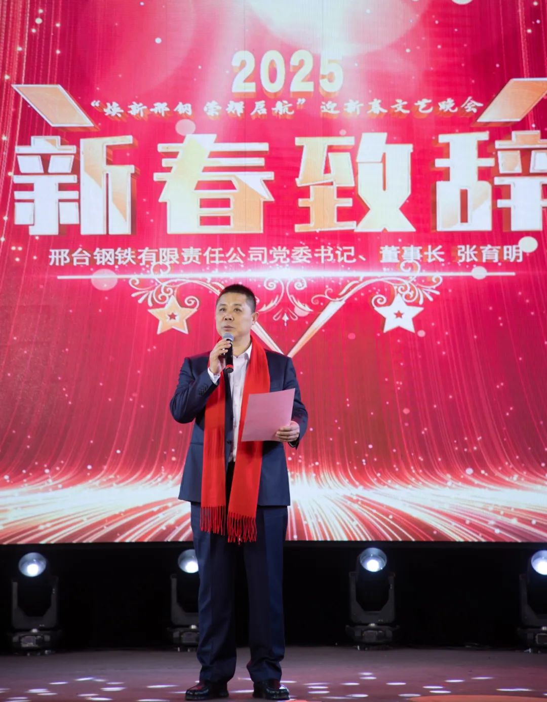 在聯(lián)歡會(huì)上,張育明董事長發(fā)表了熱情洋溢的新春致辭,代表公司、公司黨委向全體員工致以新春祝福。他說,2024年,在邢臺(tái)市委、市政府的關(guān)心指導(dǎo)下,邢鋼面對(duì)嚴(yán)峻復(fù)雜的市場(chǎng)形勢(shì),克服壓力,砥礪前行,全力保障生產(chǎn)經(jīng)營秩序穩(wěn)定,實(shí)現(xiàn)2#焦?fàn)t安全停運(yùn);各二級(jí)單位以“提質(zhì)增效、降本增效、全員降本”為主線,練內(nèi)功,挖潛能,創(chuàng)新管理,精誠協(xié)作,主要經(jīng)濟(jì)技術(shù)指標(biāo)實(shí)現(xiàn)新突破;廣大員工自覺踐行“誠信、擔(dān)當(dāng)、實(shí)干、創(chuàng)新、聚力、共贏”核心價(jià)值觀,敢擔(dān)當(dāng),有作為,為邢鋼健康運(yùn)營做出了積極貢獻(xiàn);邢鋼轉(zhuǎn)型升級(jí)搬遷改造項(xiàng)目建設(shè)穩(wěn)步推進(jìn),全力以赴抓施工進(jìn)度,精益求精保工程質(zhì)量,新邢鋼已從藍(lán)圖走進(jìn)現(xiàn)實(shí)。2025年,要專心致志抓好老廠區(qū)的安全生產(chǎn)和穩(wěn)定運(yùn)營,進(jìn)一步穩(wěn)定產(chǎn)品質(zhì)量,加強(qiáng)品牌建設(shè),提升員工的安全感、獲得感、幸福感;要嚴(yán)格落實(shí)楊猛書記“舉全市之力支持邢鋼搬遷升級(jí)建設(shè)”的指示精神,超常規(guī)推進(jìn)新邢鋼項(xiàng)目建設(shè),高效管理,統(tǒng)籌協(xié)作,確保按計(jì)劃實(shí)現(xiàn)熱試投產(chǎn)。最后,他祝福新邢鋼鵬程萬里、前程似錦,祝福偉大祖國國泰民安、繁榮昌盛。