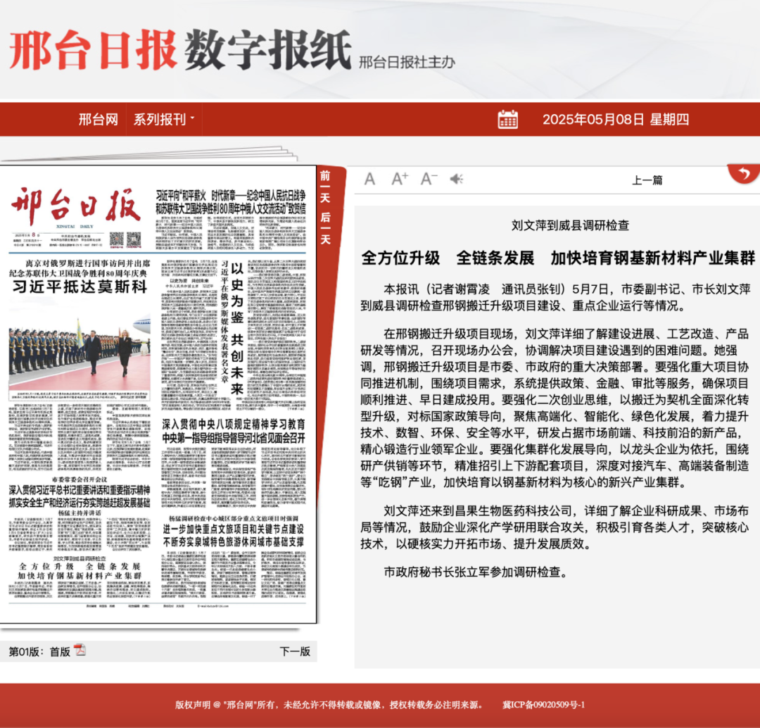 本報(bào)訊(記者謝霄凌 通訊員張釗)5月7日,市委副書記、市長(zhǎng)劉文萍到威縣調(diào)研檢查邢鋼搬遷升級(jí)項(xiàng)目建設(shè)、重點(diǎn)企業(yè)運(yùn)行等情況。